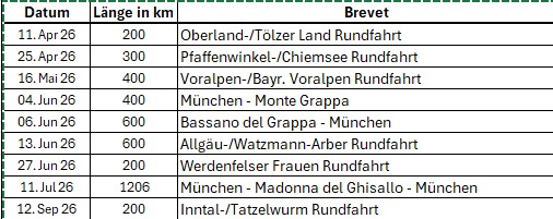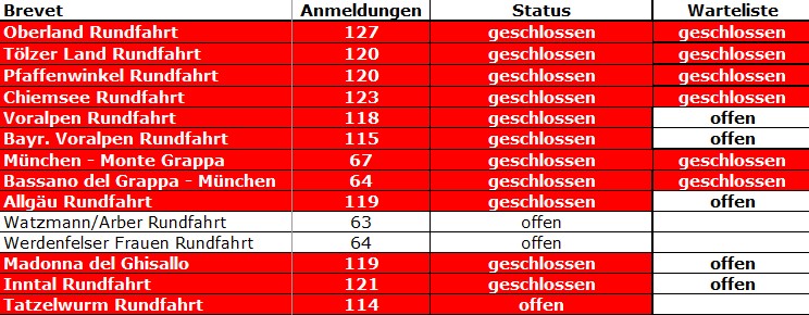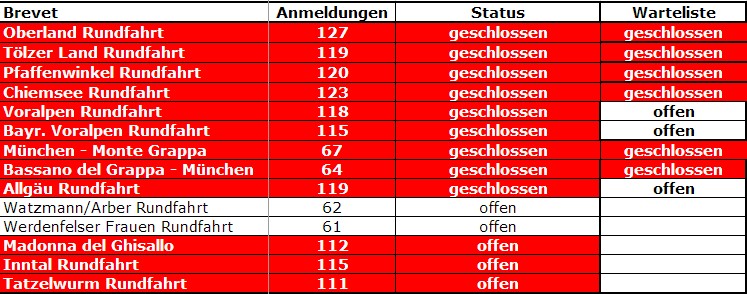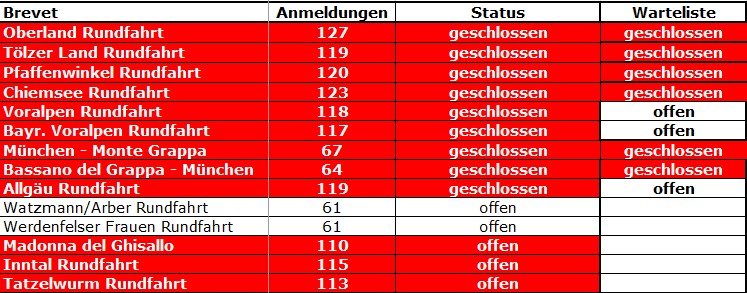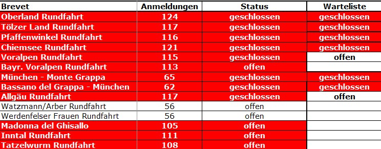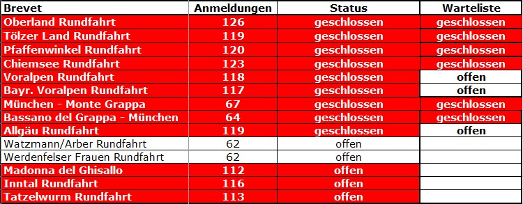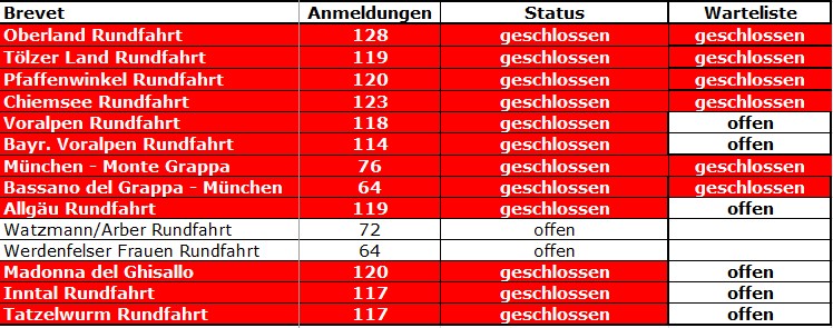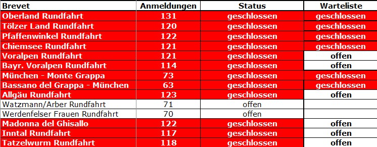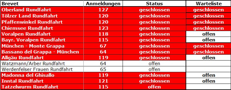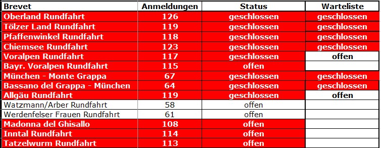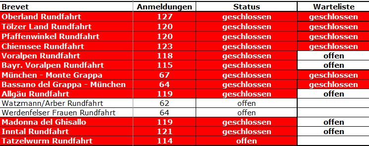 Teilnehmerbregenzung: 90 Teilnehmer pro Brevet