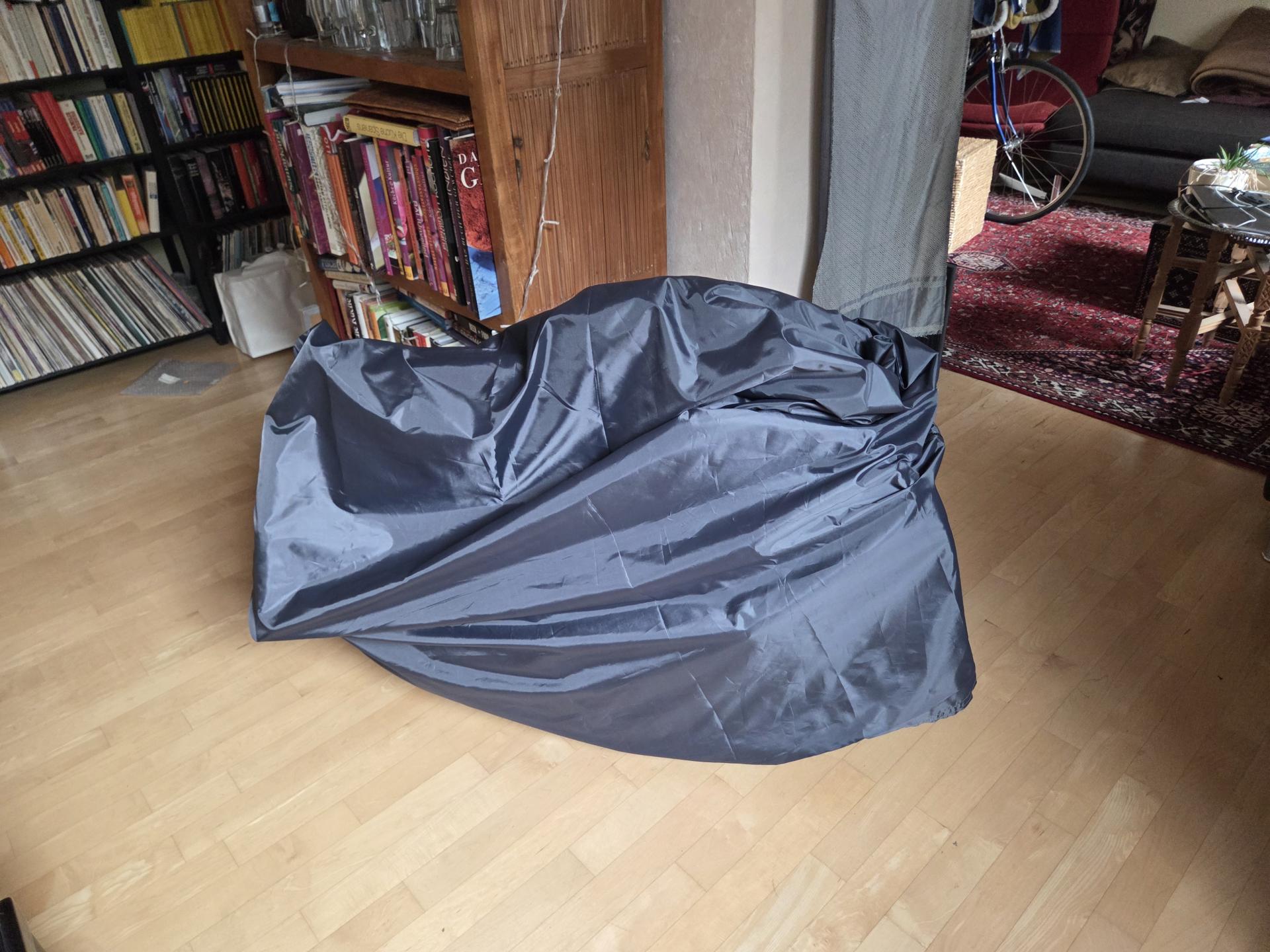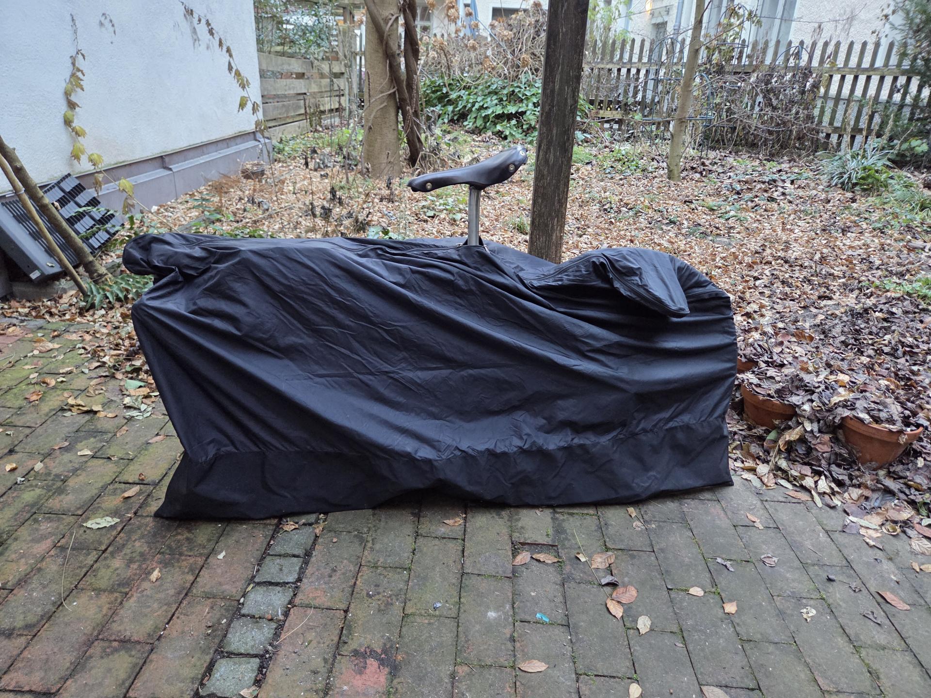 Zum Rinko-Roller habe ich mir eine passende Hülle aus dünnem, wasserabweisenden Stoff genäht. Erst am bzw. im Zug hülle ich mein Fahrrad damit ein. Angeblich gilt das Fahrrad zwar mit dem Rinko Roller als zusammengelegtes Klapprad und muss nicht eingehüllt werden. Ich bin da lieber auf der sicheren Seite und umgehe so unnötige Diskussionen mit dem Zugpersonal.